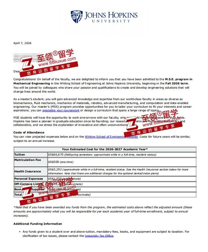 录取结果:约翰霍普金斯大学机械工程硕士录取