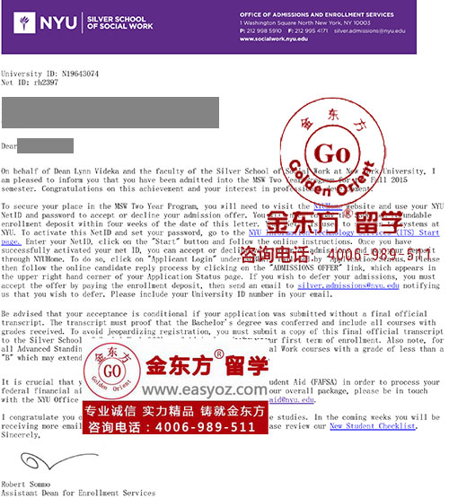 在文书和申请阶段,文书老师根据社会工作专业的特性以及考察的特点,详细地挖掘学生信息,比如工作能力以及个人品质。参与调查了一些社会现象,参与组织了多项志愿者活动,这些都既体现了学生关注社会问题,拥有爱心并且也间接反映了学生的组织能力和领导能力;而且,学生虽然不是社会工作专业的,但是文书的写作角度把这个看起来的弱项转换成了学生的有利项。确认思路之后,在文书老师的指导下,很快几近完美的文书出炉,在申校过程中因为老师经验丰富,也避免了一些问题,没有让学生走弯路,这些都为学生最终拿到心仪学校的录取提供了保障。功夫不负有心人最终同学收到了纽约大学NYU MSW录取。