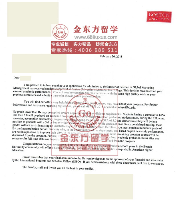 录取结果:Boston University波士顿大学,MS in Global Marketing Management 全球市场营销管理硕士